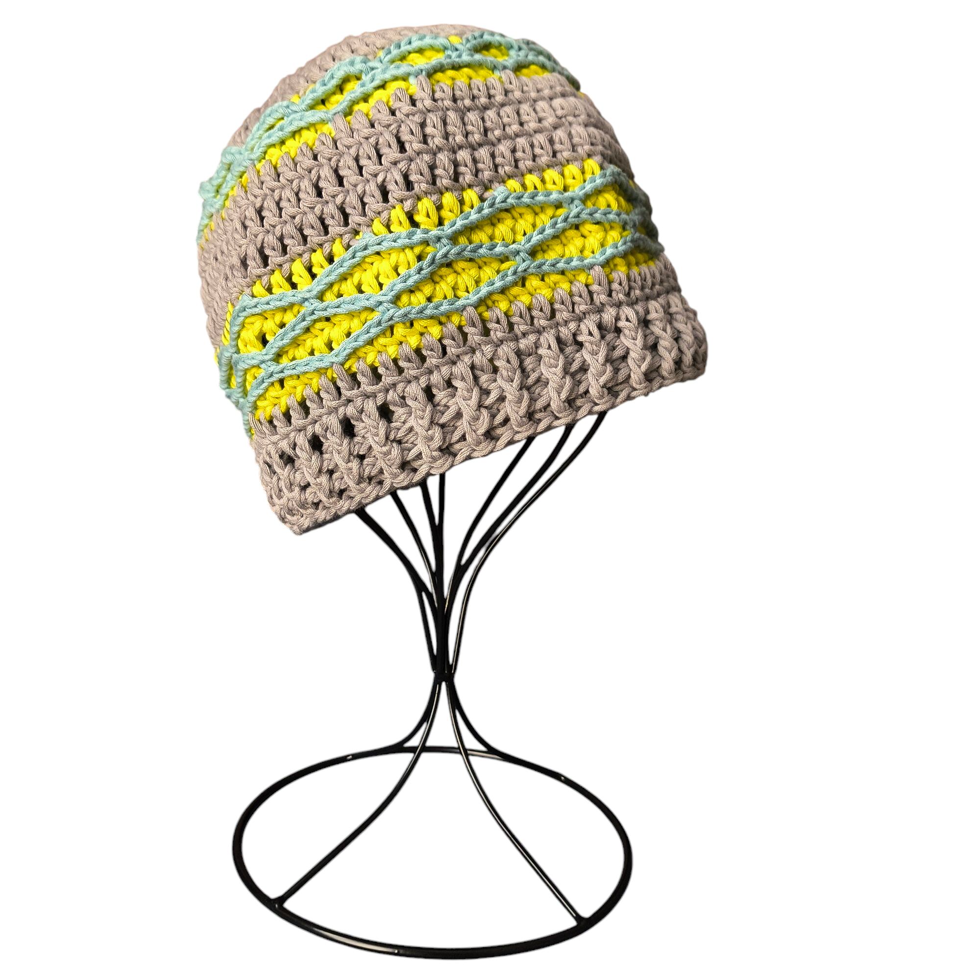 ライトグレーにイエローグリーンがアクセントのビーニー
