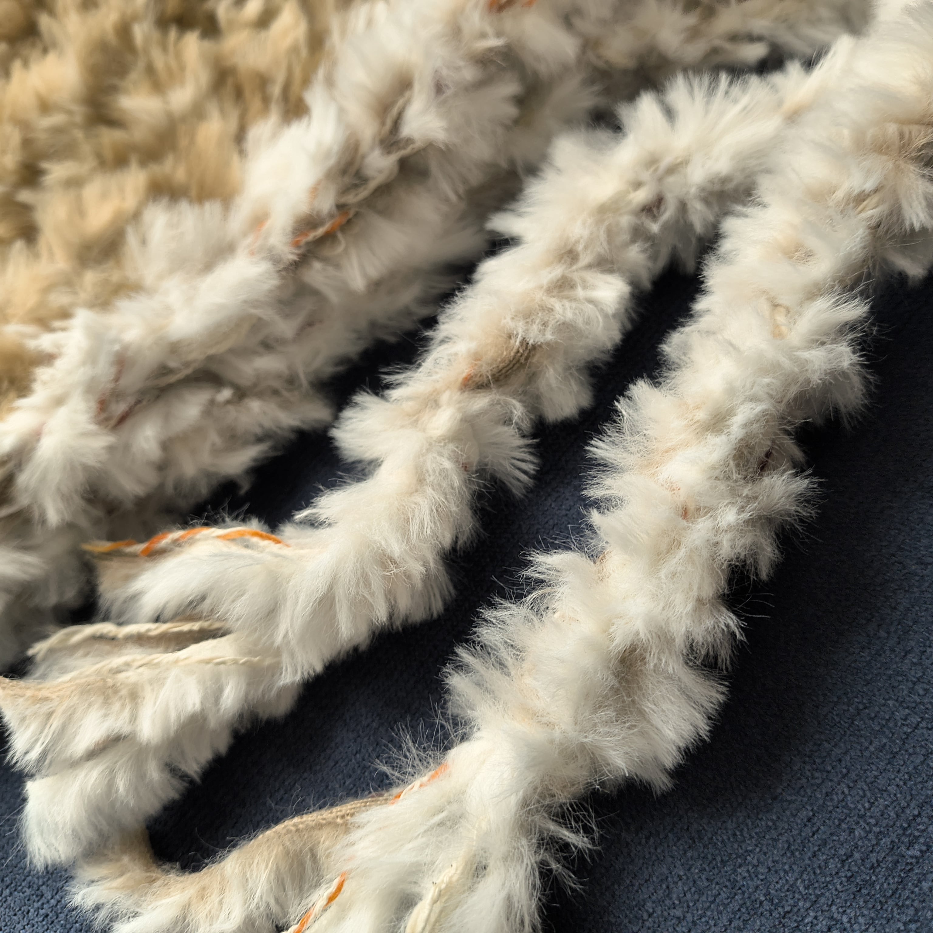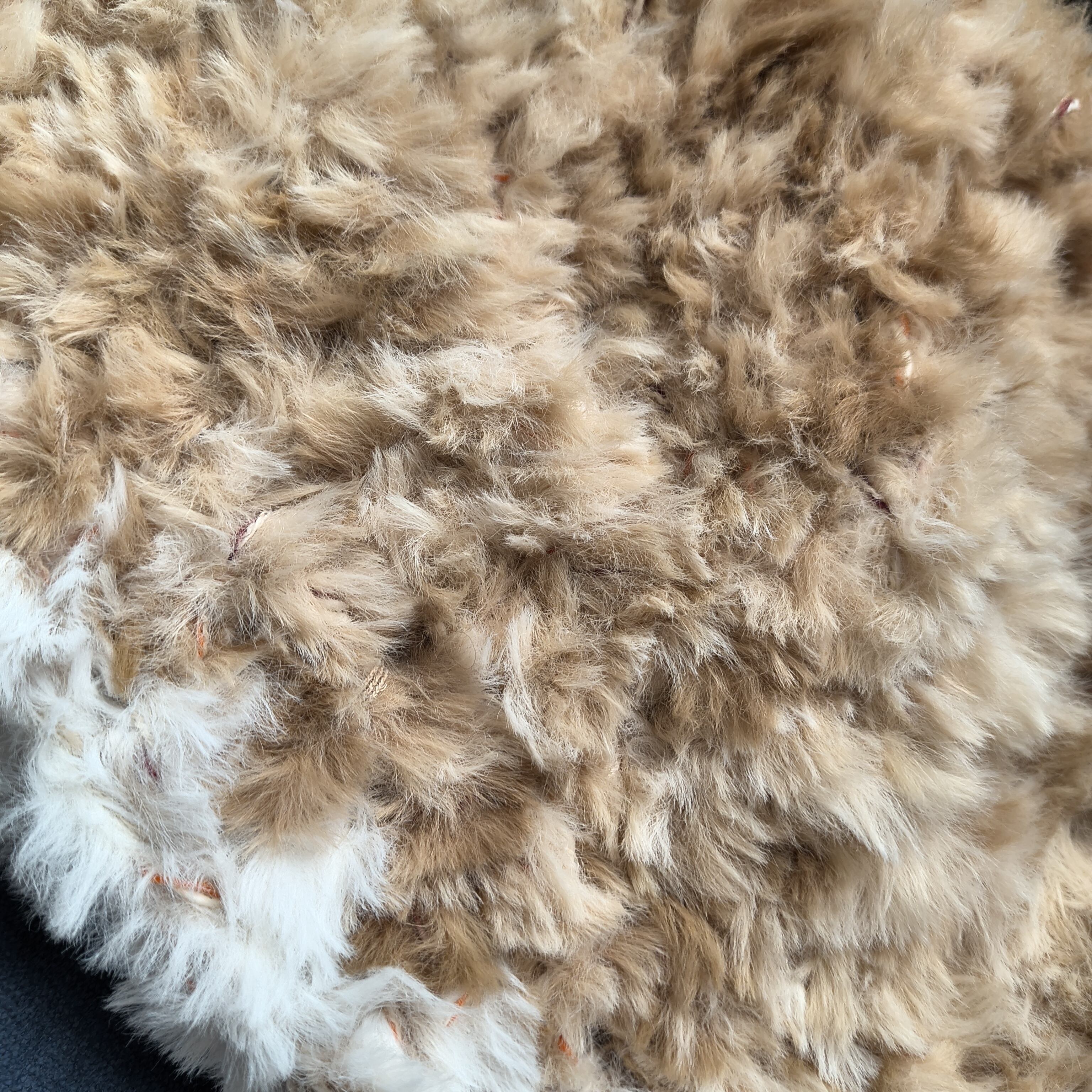 ブラウン、ホワイト、オレンジのミックスカラーが独自のスタイルを演出し、温かみのあるファーが寒い季節にぴったりです。