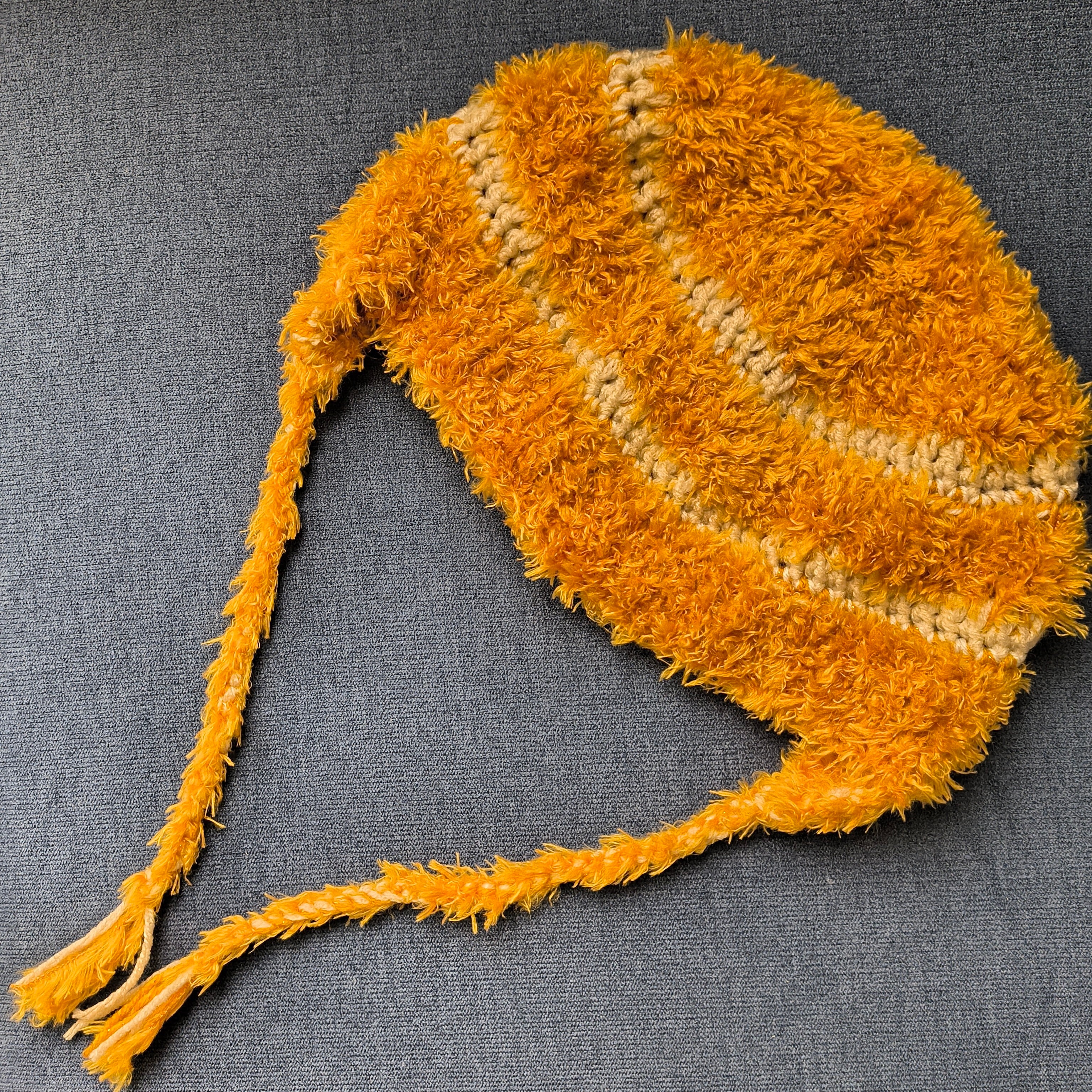 マスタードカラーとホワイトのフェイクファーニットビーニー。どんなスタイルにも合わせやすく、これからの季節にぴったりのアイテムです。