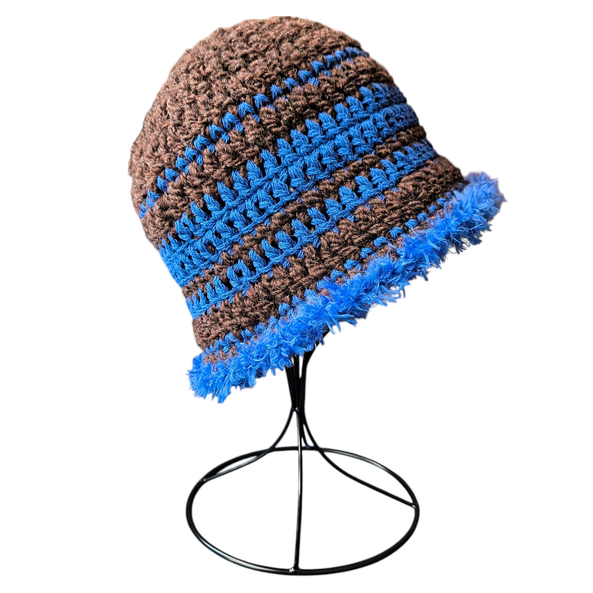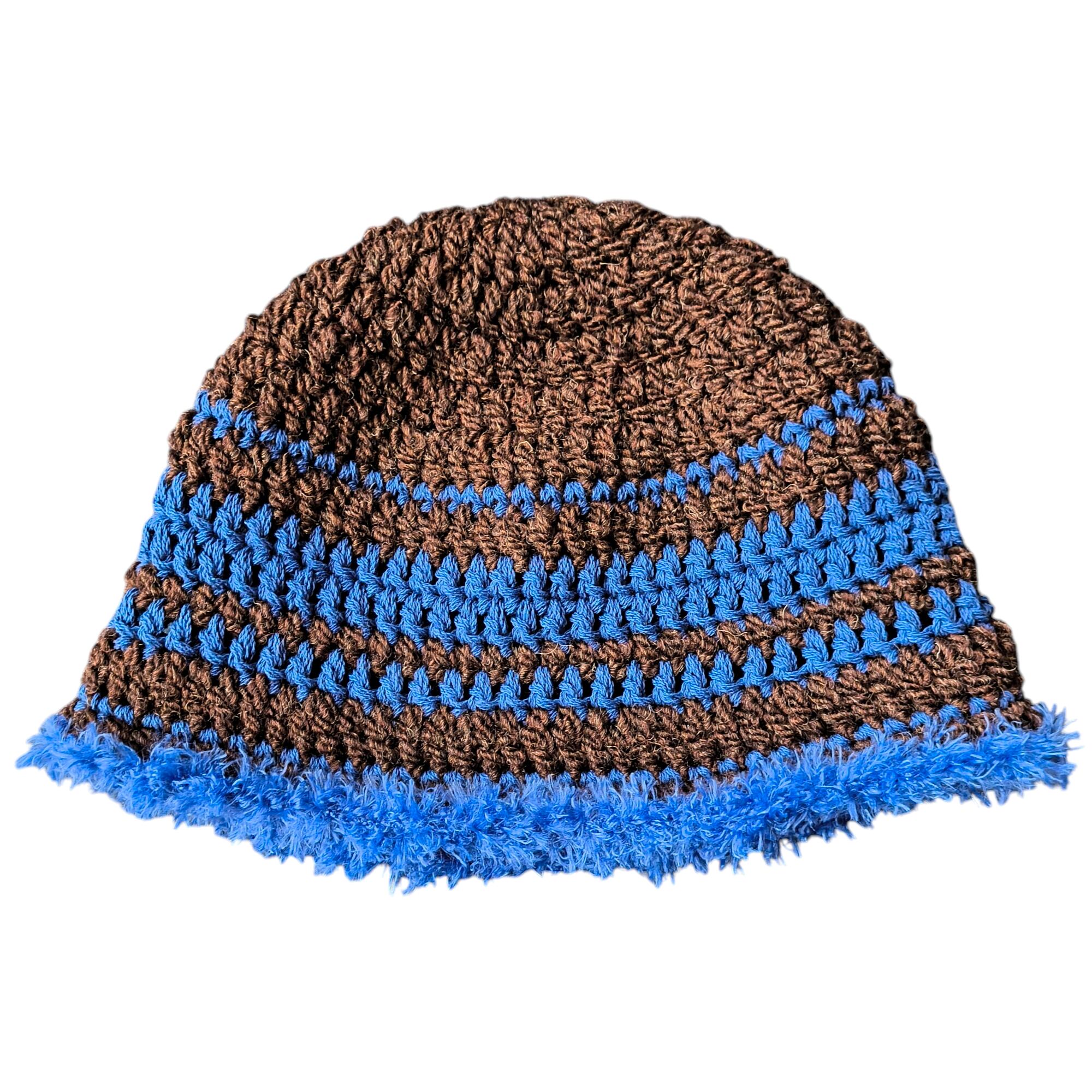 ダークブラウンとブルーの組み合わせが魅力的なニットハットです。寒い季節にぴったりで、ファッションにアクセントを加えるアイテムとして、街中やアウトドアシーンでも大活躍します