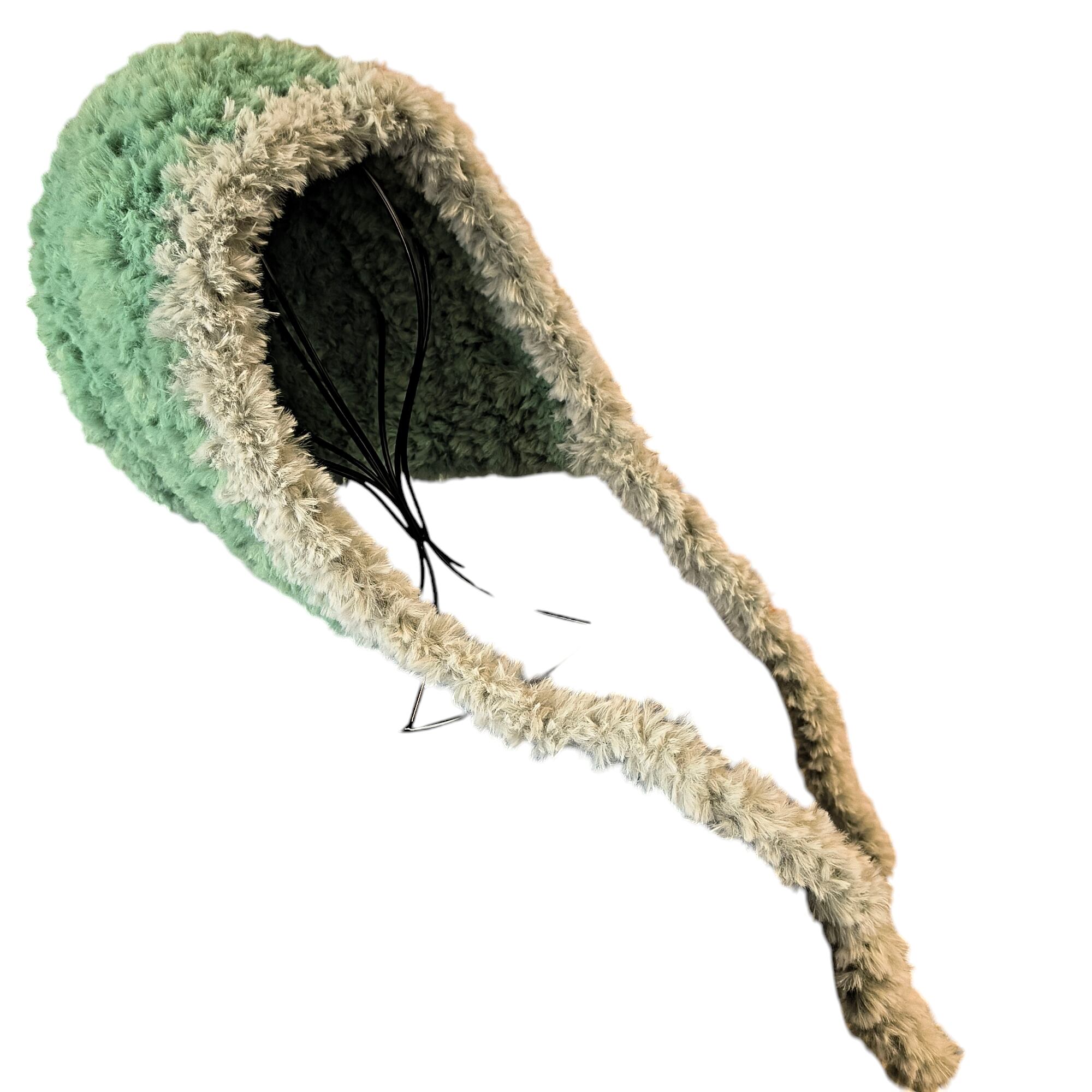 ライトグリーンと落ち着いたブルーグレーの絶妙なコントラストが魅力のフェイクファーボンネットです。寒い季節にぴったりなこのアイテムは、温かさと可愛らしさを兼ね備えており、カジュアルなスタイルに華やかさを添えます。